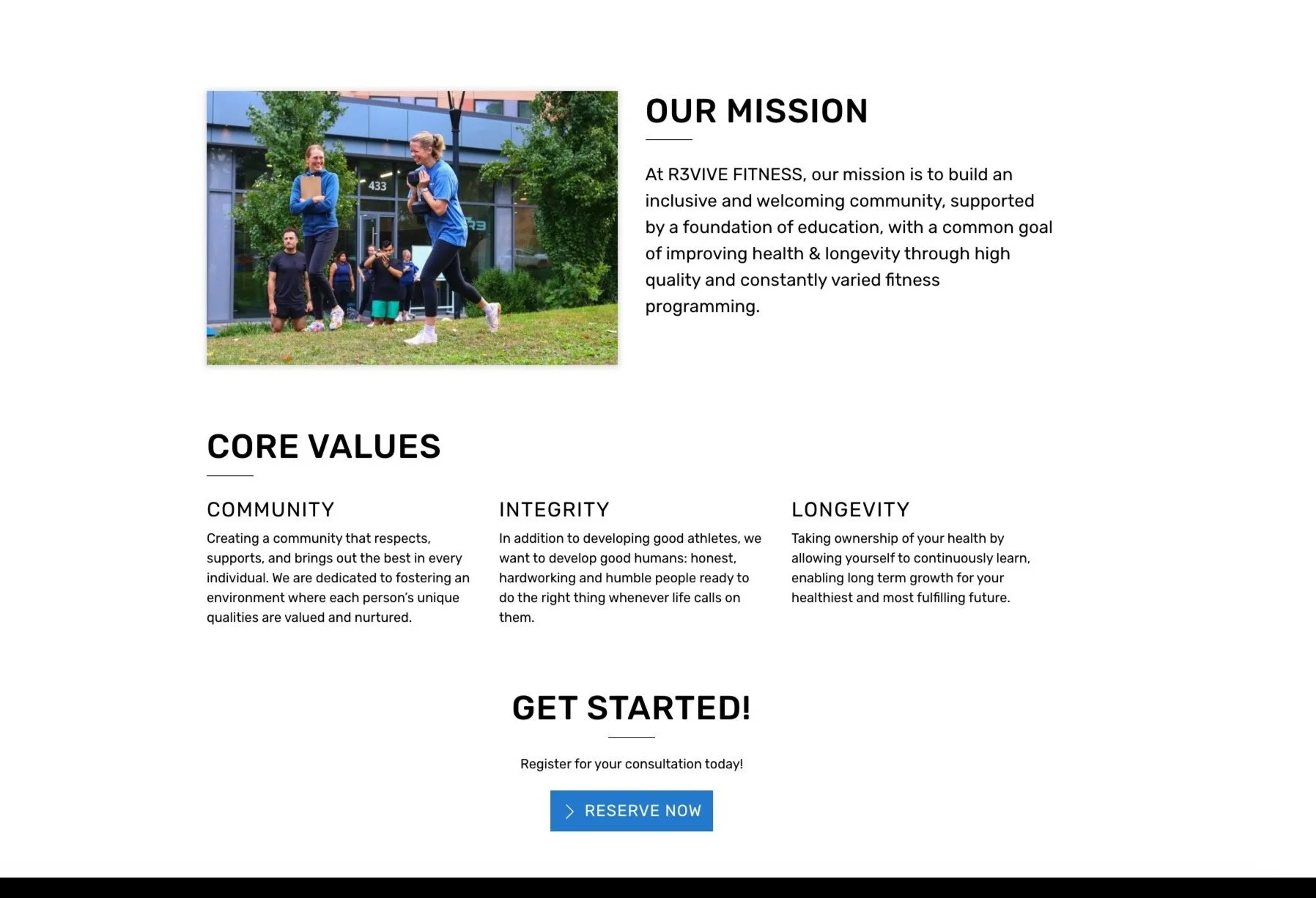Below are screenshots of the R3VIVE Fitness website before major changes were implemented. At this stage, I had updated the fonts across the site but was still in the early phases of the redesign. As part of the project, I contributed to rewriting key sections of copy and helped restructure the site to improve user experience, navigation, and brand alignment.